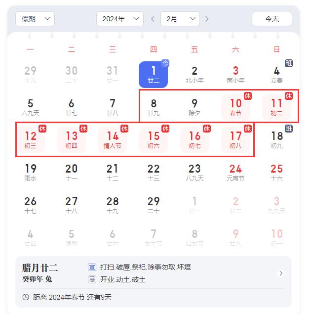 2024年2月8日 (星期四)中午至2月17日(星期六),放假時間為9天半。2月4日(星期天)、2月18日星期天為調休時間公司正常上班。