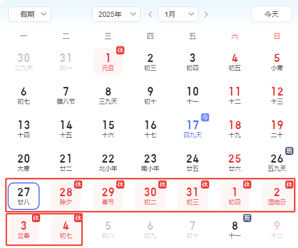 2025年1月27日 (星期一)至2月4日(星期二),放假時間為9天。1月26日(星期天)、2月8日星期六為調休時間公司正常上班。