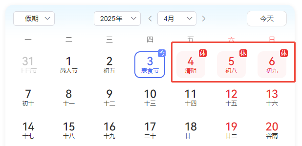 清明節假期將至,根據國家節假日放假規定并結合公司的實際情況,公司特將2025年清明節放假做以下安排: